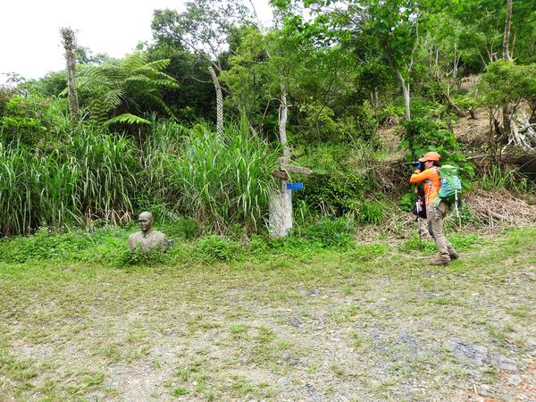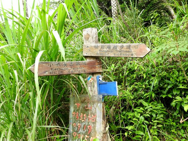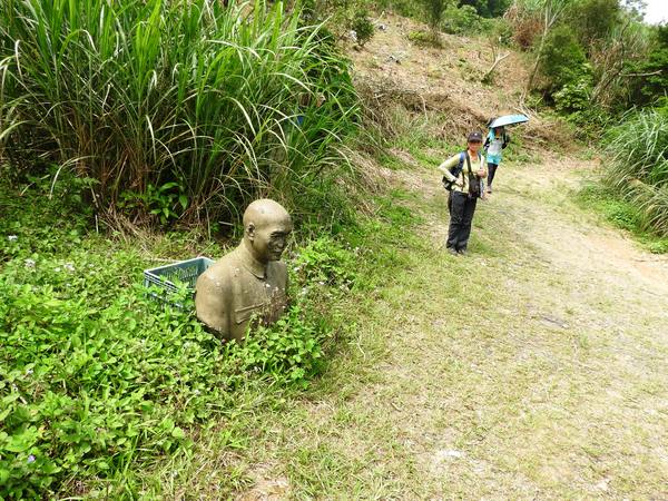 09:54 指標(右往桶后越嶺步道口2085公尺,回小礁溪土雞城3512公尺,地上有棄置的蔣介石半身銅像)