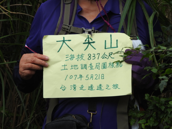 12:08 抵海拔837公尺的大尖山山頂,有顆土地調查局圖根點