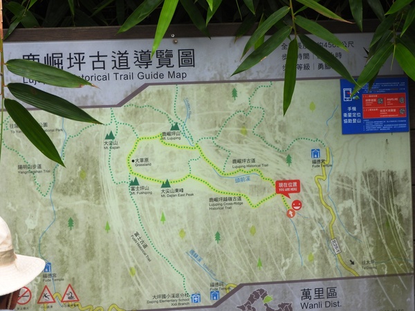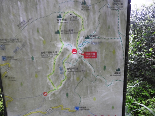 09:17 抵圳口埔鹿堀坪登山口(海拔高度410公尺),立有「鹿崛坪古道導覽圖」,左後方有顆大坪崙基石(鑛務課#263)