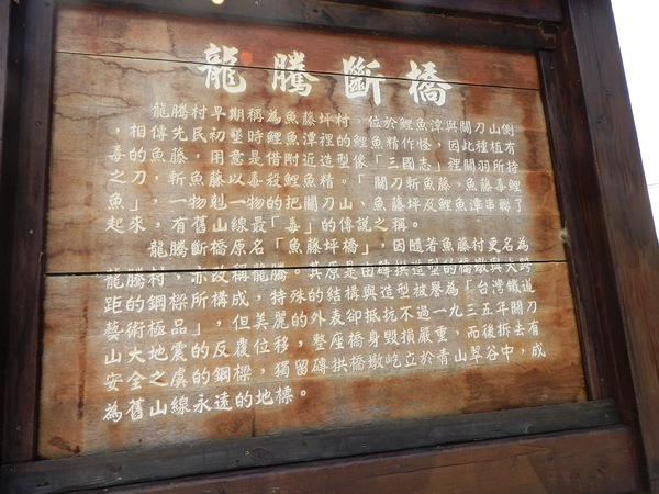 龍騰斷橋又稱為魚藤坪斷橋,位於苗栗縣三義鄉龍騰村。由當時統治台灣的日本人所建,整座橋樑以糯米砌磚,是目前台灣尚存的幾做糯米橋之一。山線鐵路泰安到勝興之間,橋長約兩百公尺,跨越魚藤坪溪。完工於明治40年(西元1905年),橋身用紅磚塊搭建而成的拱形建築,其磚造拱形的橋身由磚拱、鋼鈑梁和鋼桁梁分段構成,極為優美,橋面離地約50公尺,是全台山線鐵路最高的橋樑,在當時還被稱為是台灣鐵路中的藝術極品。