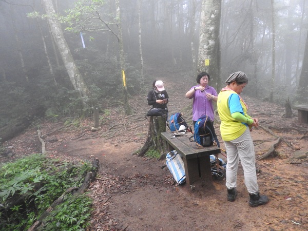 11:58 步道1K+600,巨木群環狀步道入口休息區(海拔1419公尺),處。直行則循稜往第1號巨木、瀑布、內鳥嘴山,右下往第2、3、4號巨木,在此狼吞虎嚥吃便當,因為領隊與一些山友已在此休息很久了