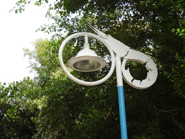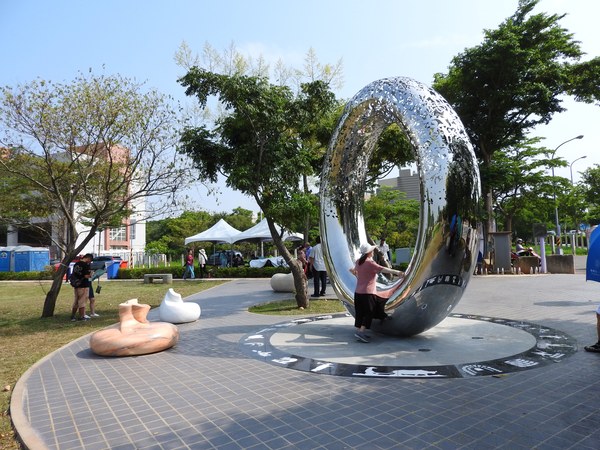 不鏽鋼鏤刻由下往上漸增,表現剛柔並濟的特色;以0之造型,代表沒有分數,運動乃為身心健康,非為競爭,無分數名次之別。擁有健康,生命才能如環一般圓滿。