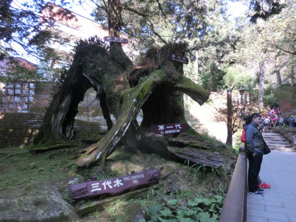 阿里山有名的三代木,位於阿里山森林遊樂區的森林步道沿線上。指的是一棵三代同株的老樹所形成的奇景。第一代的老紅檜生長了一千五百年之後枯死,主幹橫陳於地表。經過了兩百五十年之後,由於苔蘚覆蓋樹幹表層,形成保濕面,且倒塌後,上方的天空裸露,提供充裕的陽光,使得第二代種的樹苗得以在上面存活,藉著枯樹為養分,生長茁莊。三百年之後,第二代木經過漫長的歲月榮枯演化,逐漸根老殼空,再度萌發新苗,即為今日所見的第三代木。