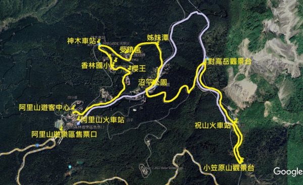 阿里山夜森林遊樂區散步路線圖(淺綠色為搭火車路線)