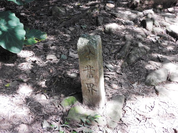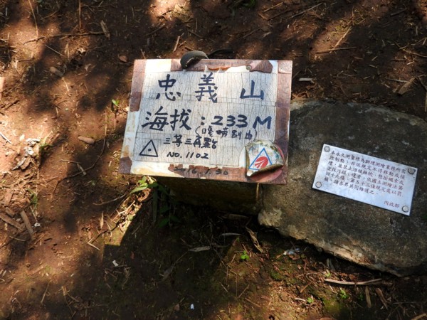 13:24 嘎嘮別山三等三角點一一○二號,海拔233公尺,也稱忠義山、小八里坌山(忠義山頂有兩顆基石,兩顆基石間有點距離,有些山友分別給予忠義山、嘎嘮別山之山名)