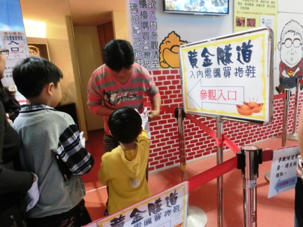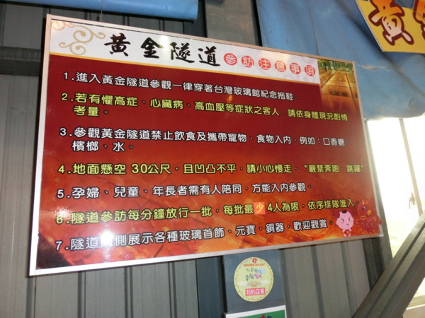 台灣玻璃館「黃金隧道」體驗區,由玻璃鏡面組成牆面,加上LED的燈光效果投射,形成科幻般的迷宮。行進過程需小心翼翼地沿著走道前進,稍不留神就很容易撞到玻璃牆。體驗黃金隧道需購買並換穿台灣玻璃館紀念拖鞋,此外工作人員會發給一付白棉手套,身上如果有其它揹飾也必須先置留下來。