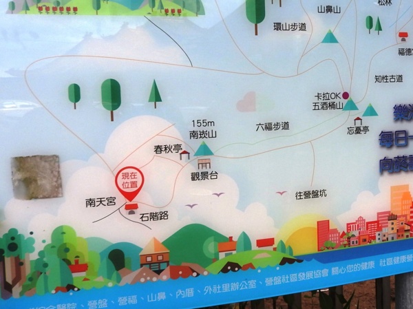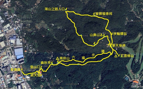南天宮→南崁山→六福步道→擎天草坪→五酒桶山→山鼻山→海山之路→崙頭福德祠→扶輪驛站→擎天草坪→五酒桶山主線→南天宮