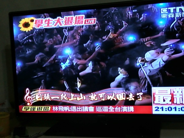學生代表陳為廷和林飛帆也於下午6時召開記者會發表談話,其中陳為廷表示:「如果政權再不悔改、如果議會還是被寡頭、被財團所把持,我們終將回來,而且不只回來這裡。」而林飛帆則是表示在結束佔領立法院行動後將會繼續於民間社會展開串連行動,之後帶領帶領眾人深深鞠躬。在議場內部宣讀《人民議會意見書》以及草根論壇結論後,下午6時7分參與佔領議場的學生和民眾手持向日葵陸陸續續從立法院議場正門離開,隨後將手上的向日葵傳給在外等候的2萬名支持群眾。而在佔領議場的抗議學生與群眾全數撤離之後,警方立刻在立法院中興大樓架起拒馬以防止有民眾再次進入議場。之後學生代表則在濟南路主持晚會現場,而在晚會最後立法院周邊濟南路和青島東路的支持民眾共同歌唱《島嶼天光》。