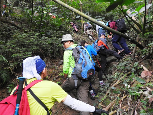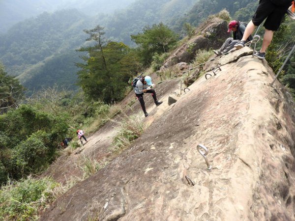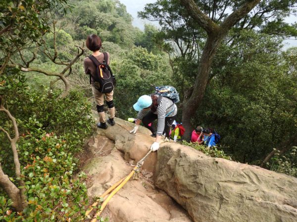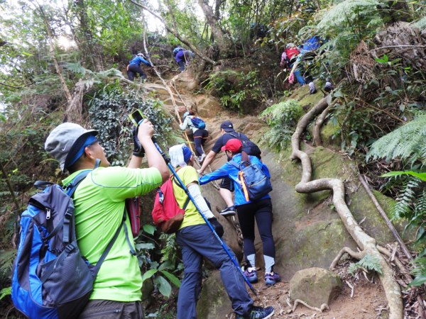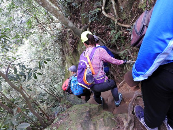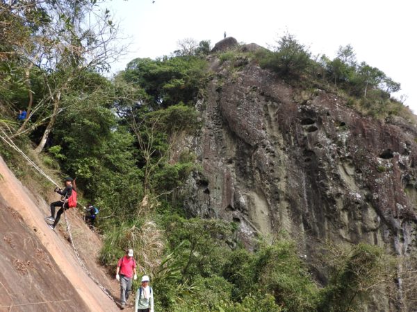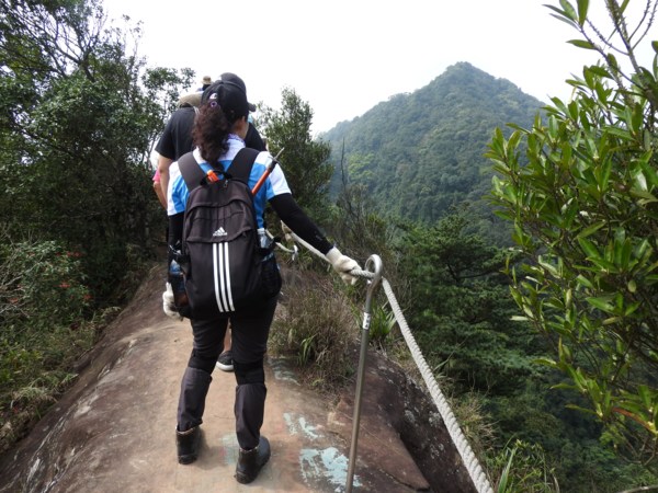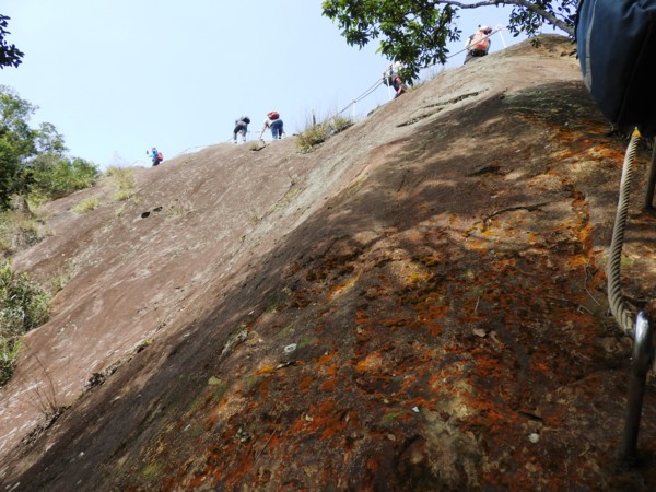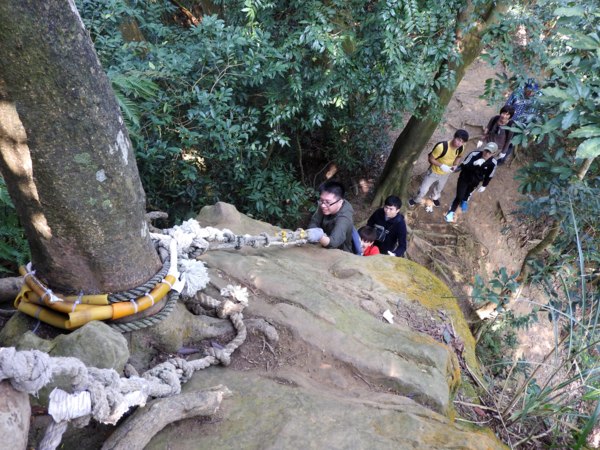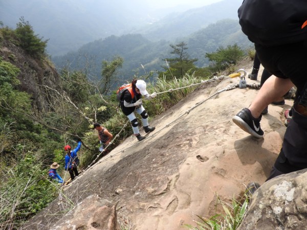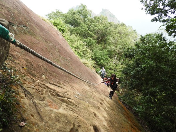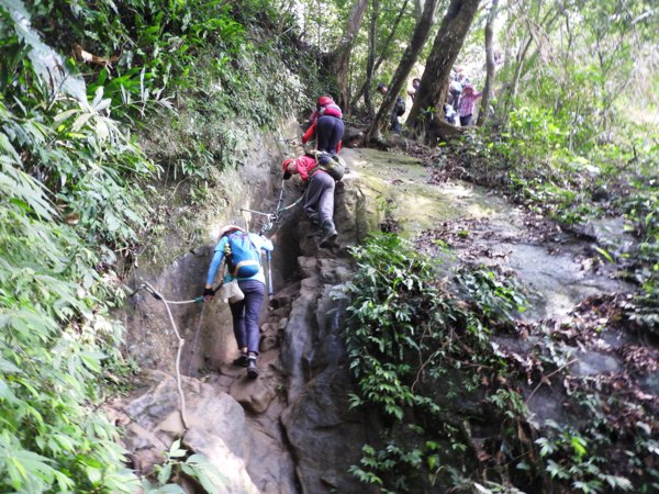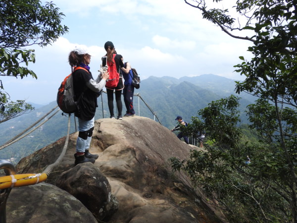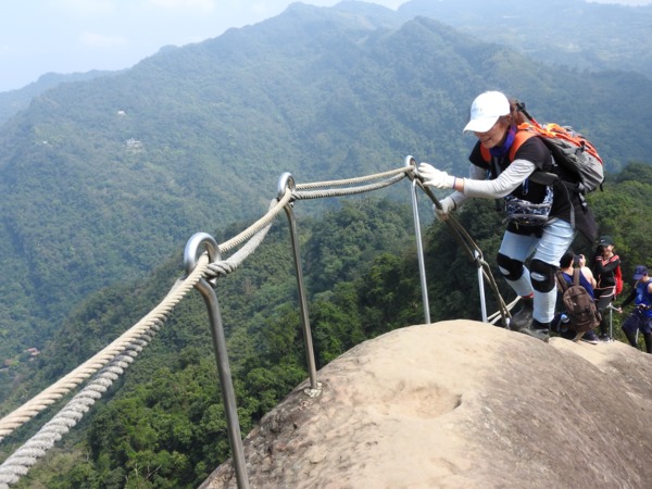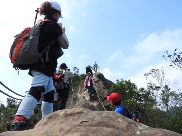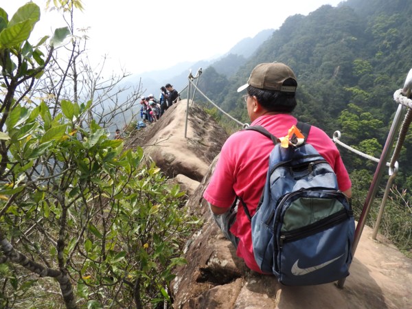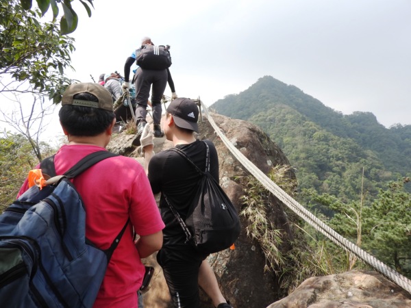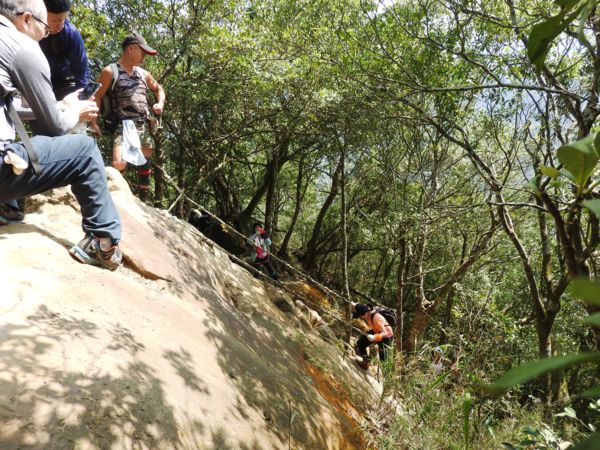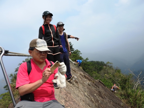 12:04 抵「峭壁雄峰」(海拔565公尺),等候拉繩垂降,大塞車