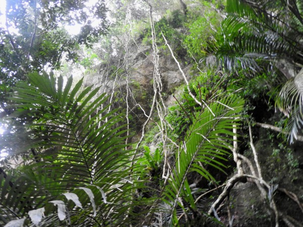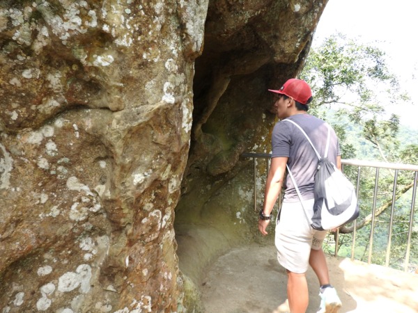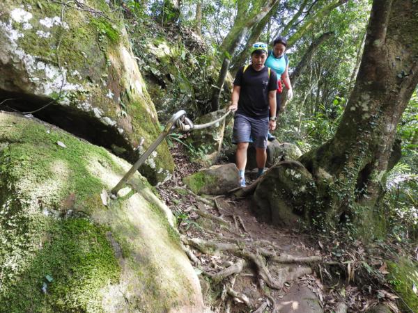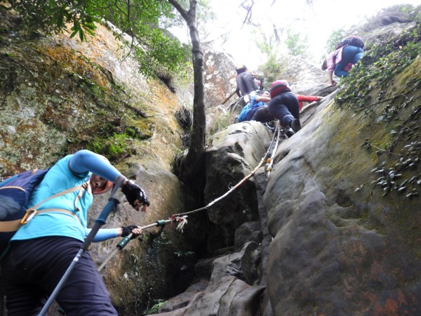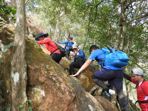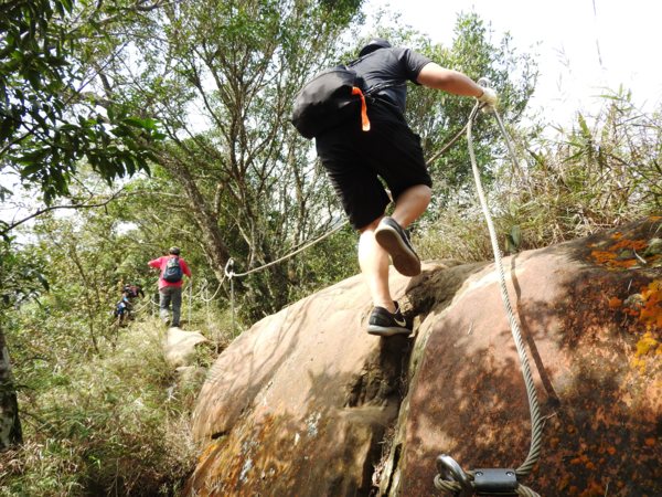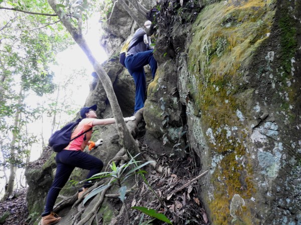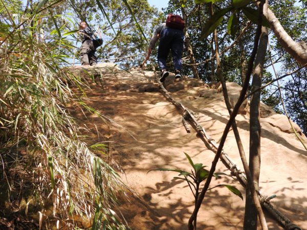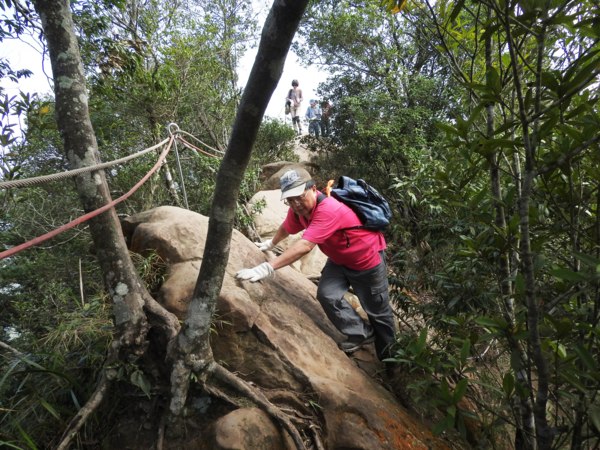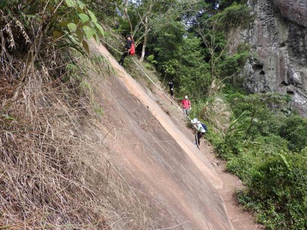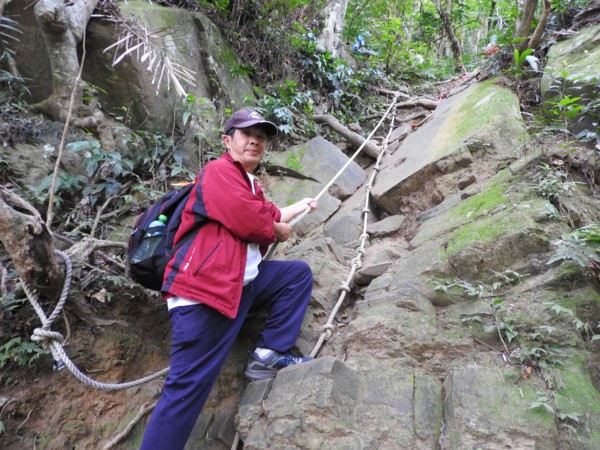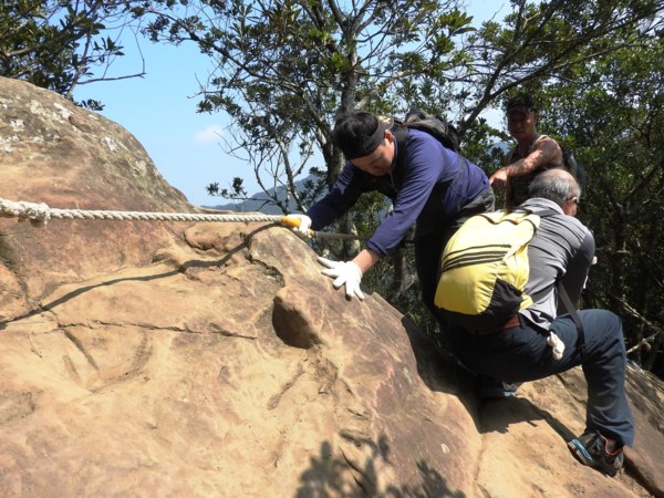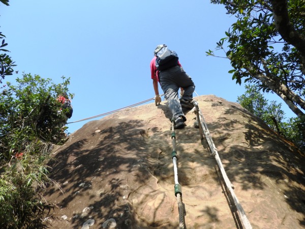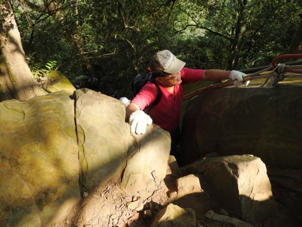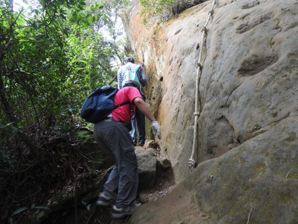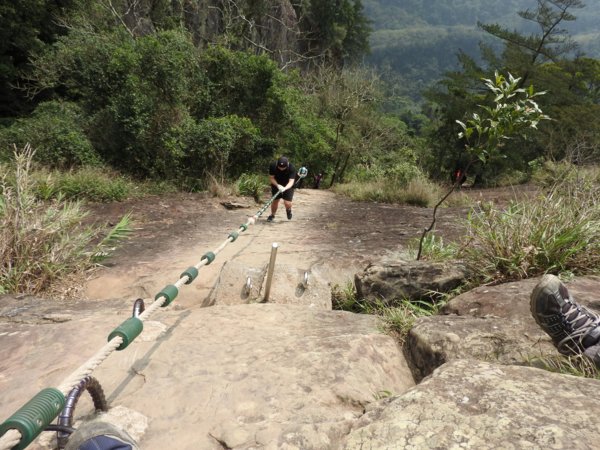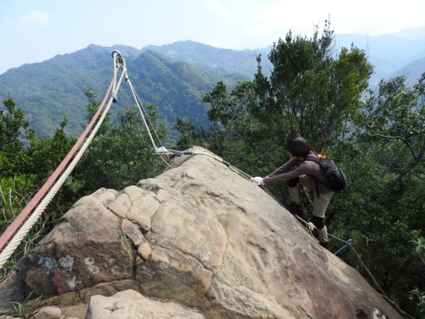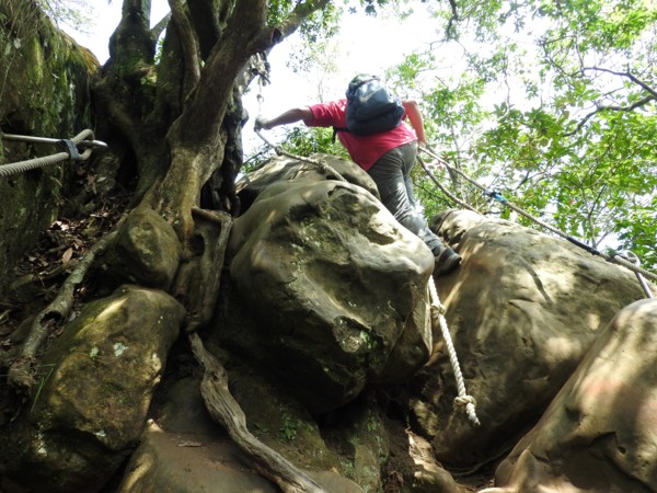 13:30 攀繩陡上巨石,回望「峭壁雄峰」