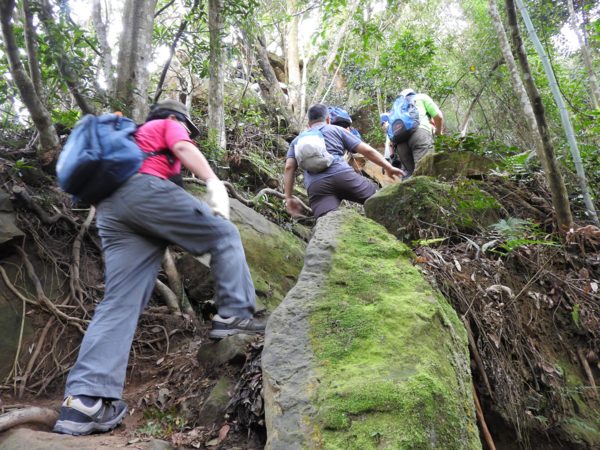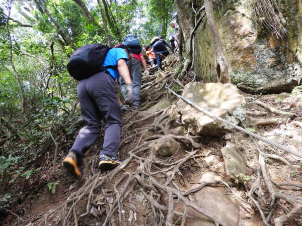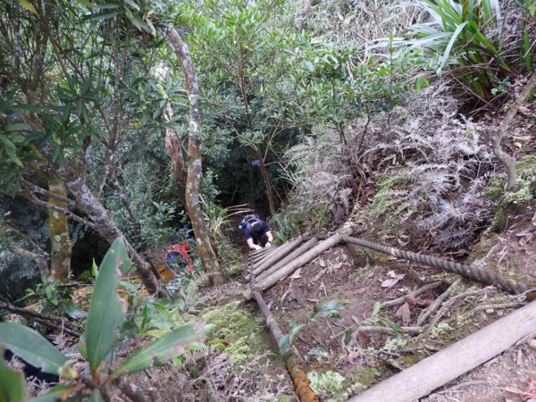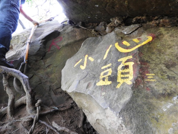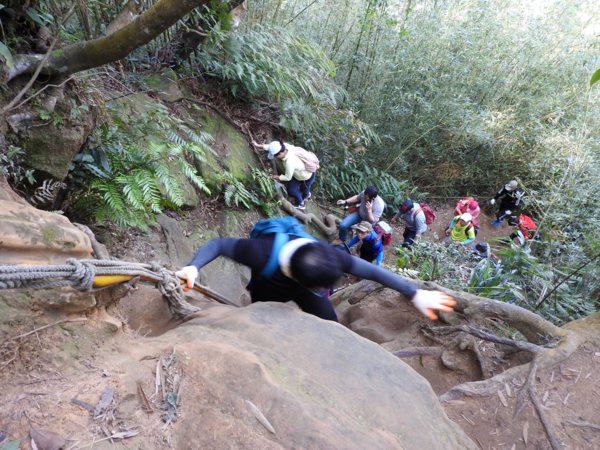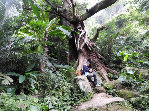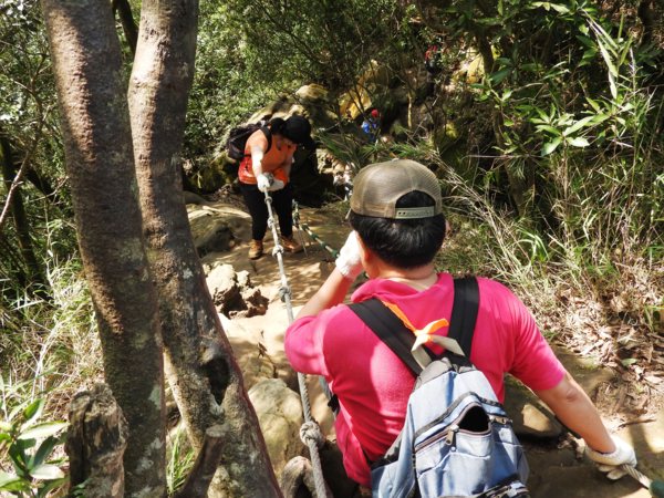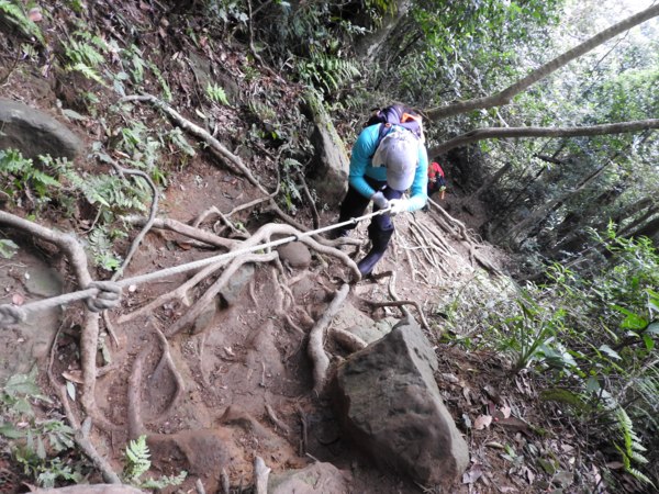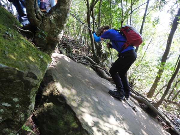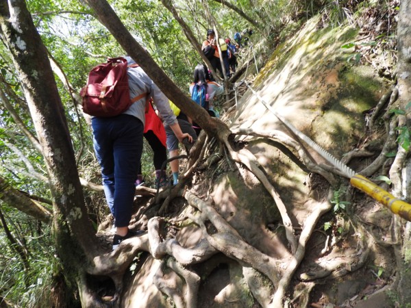 13:53 拉繩垂降抵登山地圖位置7號點「茄苳樹鞍部」岔路口 (海拔536公尺),取左上