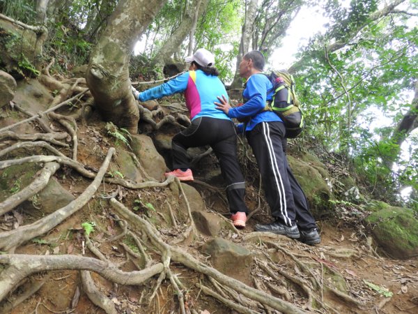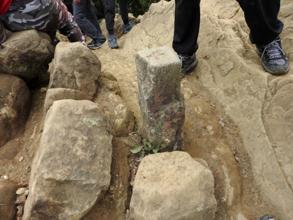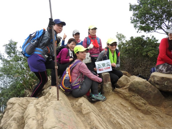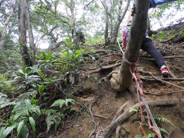 14:12 一路拉繩攀樹根陡上,抵今日最高點「五寮尖」(又稱湊合山或鳳髻尖,H639m,有顆總督府圖根補點)