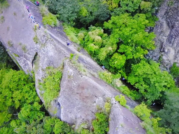 12:49 垂降處(垂降路線有兩條,比較邊的那條又陡又長,落差約30公尺左右。中間一條樹木比較多,可抓踩的地方相對也比較多,感覺比較不那麼可怕,但塞車中,只好選邊邊那一條垂降,練練膽子) 開始垂降30米