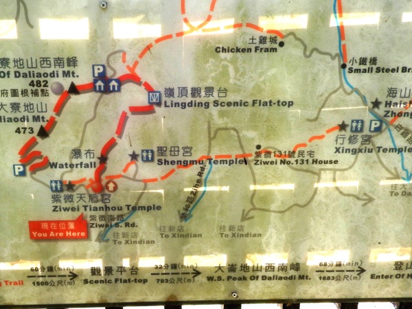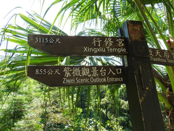 14:08 由紫微天后宮廟埕的左側金亭邊進去,抵紫微聖母環山步道導覽牌(離行修宮3,115公尺指標木柱)