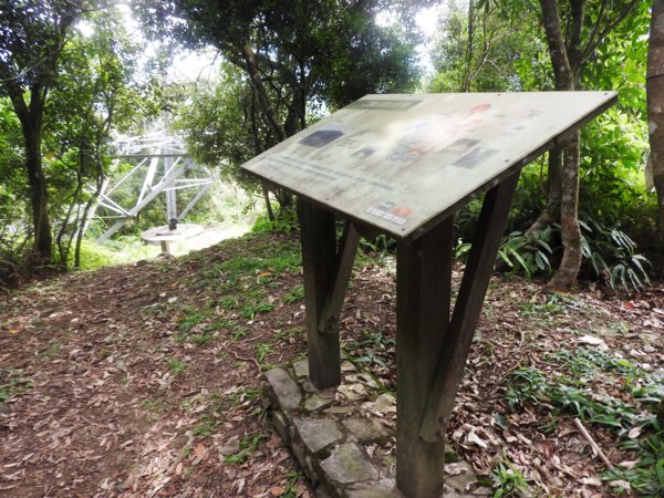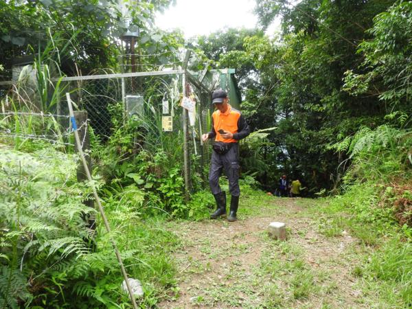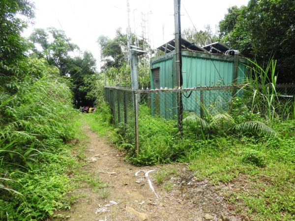 12:01 終於抵達海拔728公尺的直潭山山頂,1045號二等三角點約在登山步道3.3/5.1K處,山頂腹地設有氣象局雨量自動測報系統(直潭山中繼站)與基地台,登山隊在此休息午餐