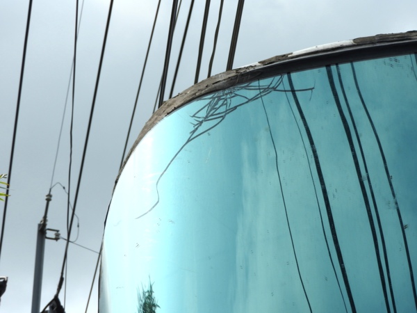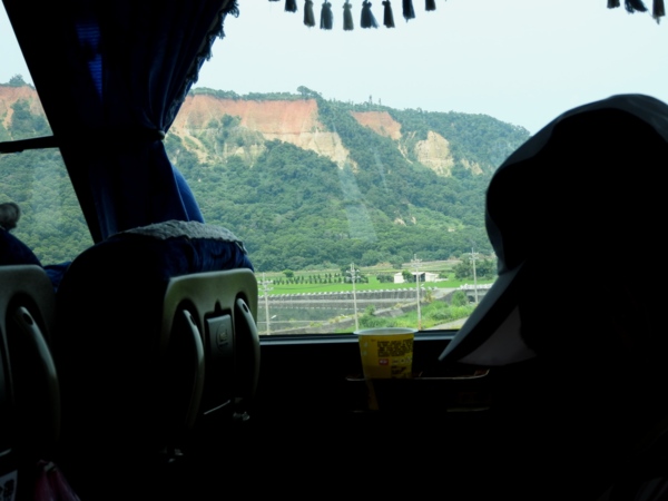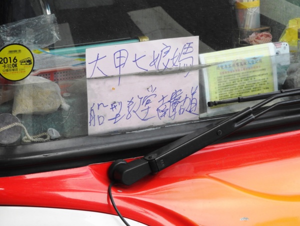 14:05 遊覽車在大甲市區繞了一圈回到劍井附近,車頭玻璃被樹枝刮到的地方,說是為保險理賠拍照存證