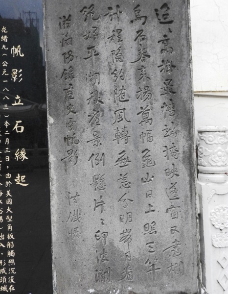 烏石港與頭城港歷經滄桑、海填陸生,昔日船舶出入的盛景不再,後人見景生情,感觸良多。日據時期,盧纘祥(字史雲)曾撰「帆影」一詩,描述港口風光;昭和十三年(西元一九三八年)洪鐵濤遊歷蘭陽,以「帆影」為題,即席揮毫。本件書法為康灩泉(字海秋)收藏,及民國五十七年(西元一九六八年)頭城鎮長邱金魚將此書文勒石,立於慶元宮,以供後人憑弔,即成本碑。