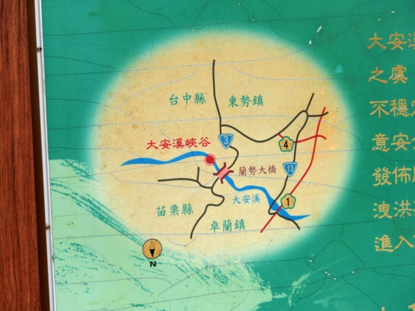 大安溪大峽谷,又稱卓蘭大峽谷,外觀呈峽谷地貌,此處恰為苗栗縣卓蘭鎮和臺中市東勢區交界。