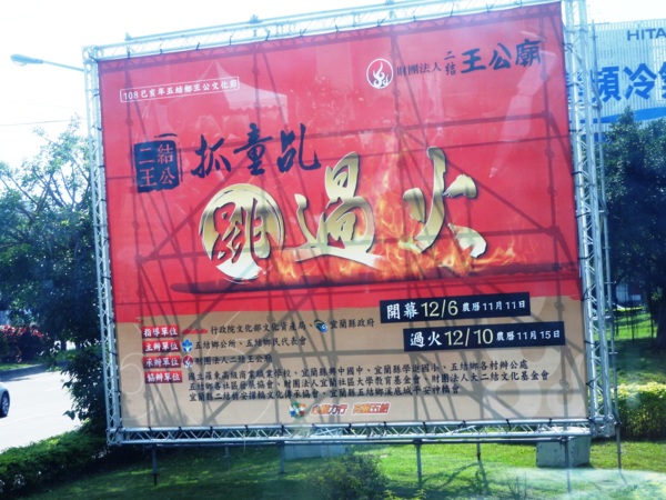 王公壽誕當天重頭戲「過火」儀式,上午7時由當地耆老與資深人員擔任的「火炭組」,會先進入王公廟內向王公請火、起火,等一切就緒下午再向王公擲筊請示進行「過火」活動。早年跳過火使用的硬木炭,重量將近2萬斤,現在因顧及環保減量至1萬餘斤。