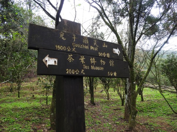 12:47 接上大湖尾產業道路,指標「回往鬼子瀨尖山1065公尺/35分鐘、茶博館3200公尺/106分鐘,源茂山2235公尺/75分鐘」