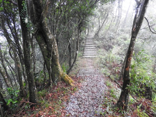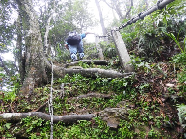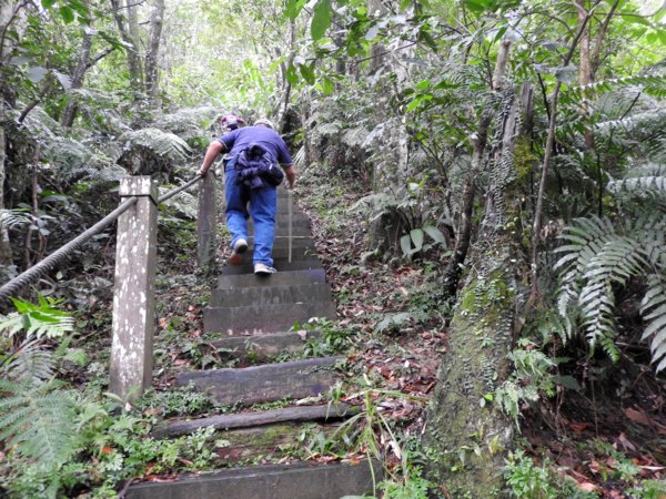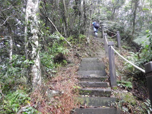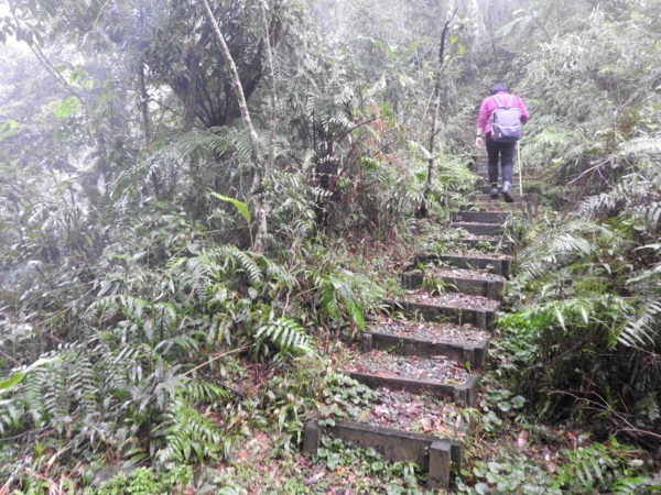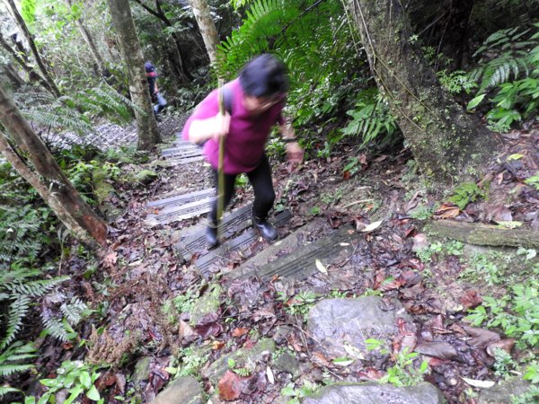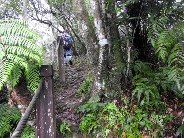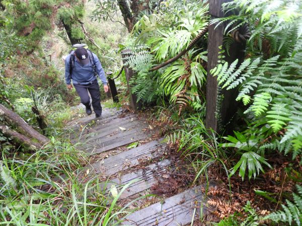 10:53 休憩桌椅平台(H256),旁邊有「大尾山步道」2.8/3.2K里程樁,步道改為木板土階,一路陡上,挑戰由此開始
