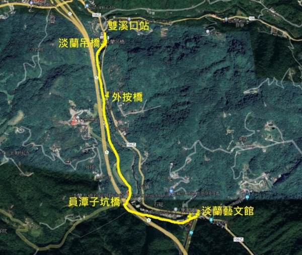 外按古道又稱為淡蘭古道石碇段,由雙溪口的淡蘭吊橋走至石碇老街,全長約2公里,以外按橋為中點,分前後兩段,前段走於北宜高速公路的橋墩下方,後段步道經溪畔的樹林間,綠意盎然,一路平緩好走,溪岸狹壁處,鋪設棧道以利遊客行走,可見溪中成群的溪魚,令人驚艷。