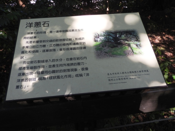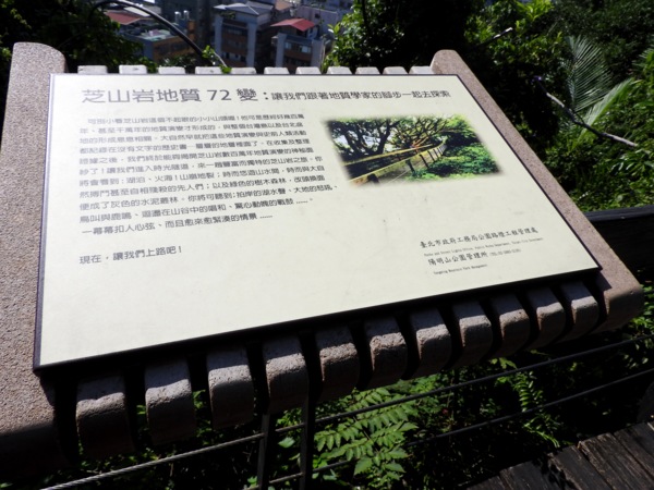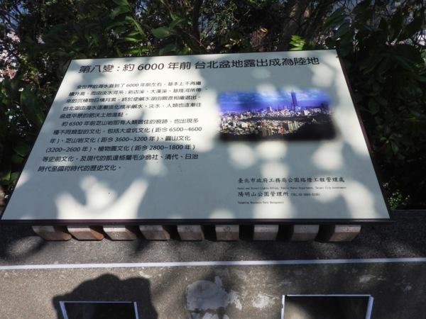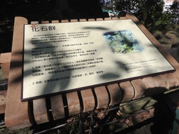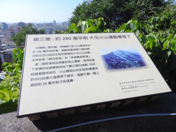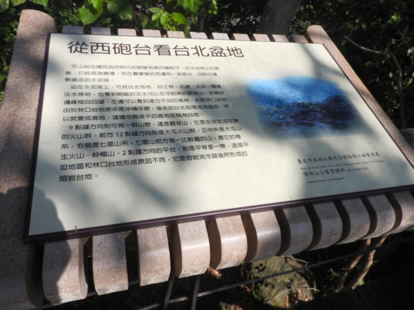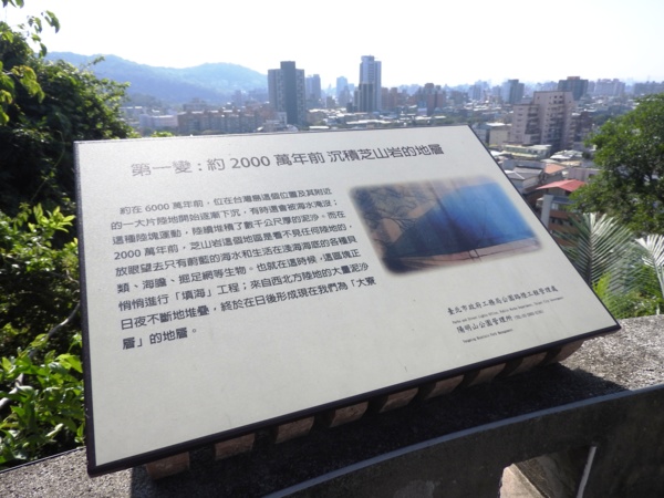 環砲台遺跡的圍欄上解說牌,從2000萬年前沉積芝山岩的地層說起,歷數芝山岩的地質72變,只要有興趣、有時間,可以跟隨著台灣島、芝山岩岩層的時光流轉,瞭解台北盆地的形成和如何演變。