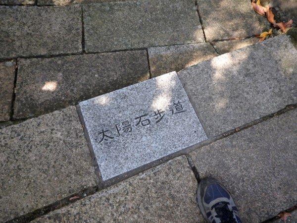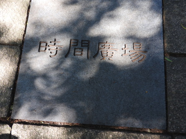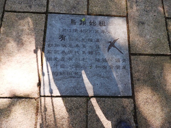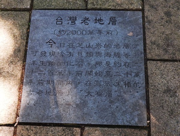 時間廣場裡,地上黑灰相間的石磚刻劃著,芝山岩地質形成與歷史人文的文字說明。