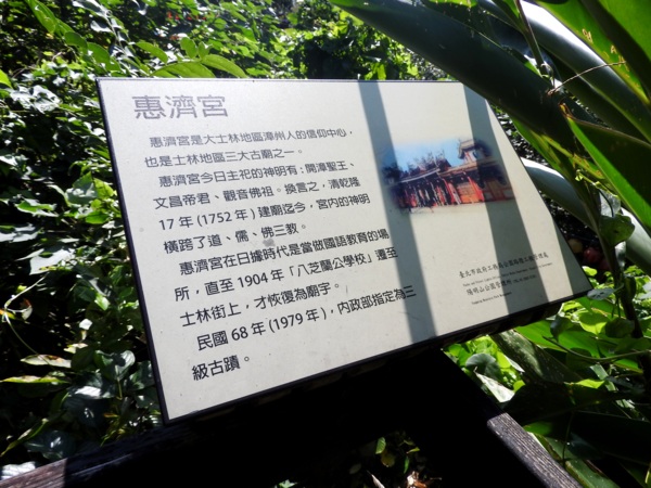 乾隆年間,入墾臺北士林地區的漳州籍移民在芝山岩上陸續興建了奉祀開漳聖王的惠濟宮、奉祀觀音佛祖的芝山巖(「巖」是閩南漳州、泉州人對靠山佛寺的稱呼,也可作為佛寺所在之山名)、以及奉祀文昌帝君的文昌祠,這3座廟宇經過歷次修建而結合為今天所見的惠濟宮,與士林神農宮、慈諴宮同為士林地區最主要與古老的3座廟宇。