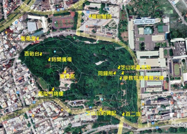 陽明醫院→聖佑宮→時間廣場→西砲台遺跡→惠濟宮→同歸所→學務官僚遭難之碑→芝山岩最高點→百二崁→芝山合約碑記→西隘門牌樓→聖佑宮→陽明醫院