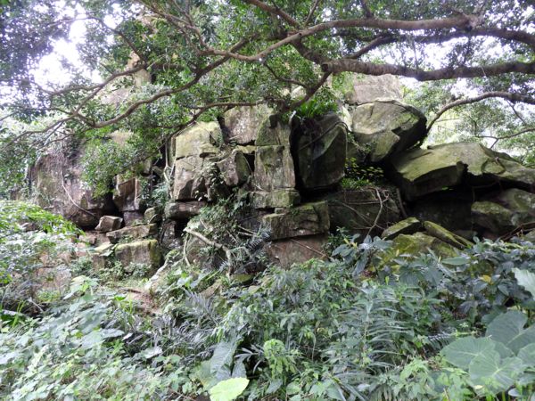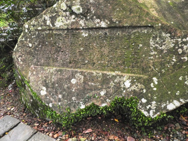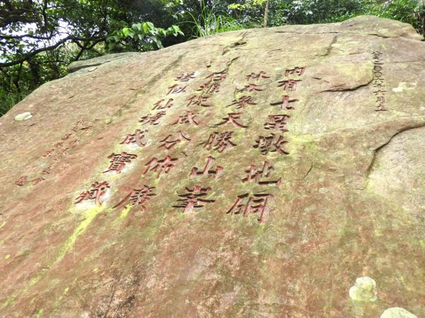 「七星堆」前之大石,有鄉民代表題字「內有七星墩地硐,林森參天勝山峰,石堆促成分怖廣,塔似仙境成寶藏」