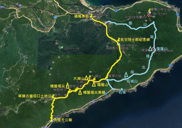 雪山山脈北起新北市貢寮區的三貂角,由北端首座山峰「荖蘭山(靈鷲山)」一路向南延伸,「雪山尾稜」即是於東北角入海前這段最尾端的稜脈。「雪山尾稜南段」以福隆火車站為起點,由有「隆嶺夕煙」美稱的隆嶺古道進入,是淡蘭古道之中最早開發的一段,古樸幽靜的古道,有涓涓小溪相伴。行至石城仔嶺土地公祠,此為雪山尾稜南、北線分段點,經福隆山、大湖山(大湖堀山)、桶盤堀尖東峰、桶盤堀尖等山頭,最後接草嶺古道,終點至大里火車站。