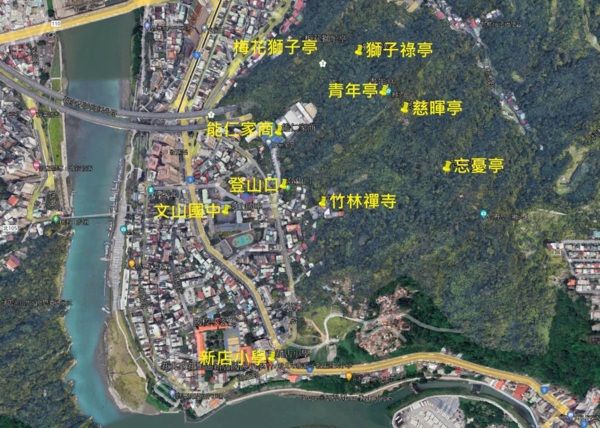 能仁路登山口→梅花獅子亭→獅子壽亭→獅子祿亭→青年亭→慈暉亭→忘憂亭→慈暉亭→竹林禪寺
