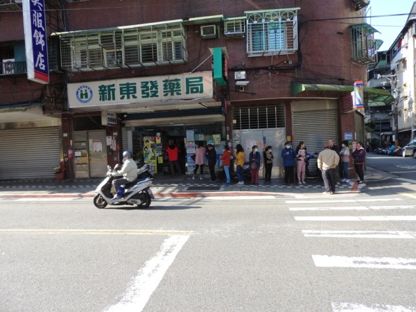 一堆人在健保藥局前排隊購買「實名制」口罩