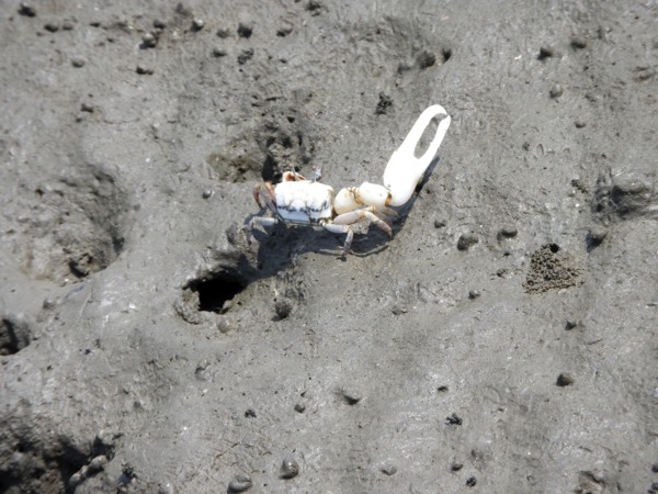 清白招潮蟹又稱白扇招潮蟹,整體常為白色,但步足及小螯的內側有時會呈紅棕色,居住洞口通常築塔,揮舞時大螯動作極大。是族群數量最多的蟹種,台灣西部之泥沙質潮間帶地區都有廣泛分佈。