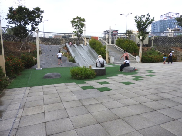 3樓則設計為輕食餐廳,戶外平台則有沙坑、戲水池及草坡設計,提供市民休憩空間,並可眺望頭前溪河岸平原風光;4樓到5樓是3座高空溜滑梯,5樓則為漂浮平台,明年整修完工後,將成為親子最佳的探索與創意夢想基地。