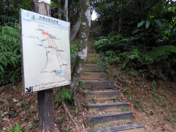 10:38 發現「內溝山登山步道」登山口,指標寫往「老鷲尖山3000公尺」,但不知能否登「學頭坡山」,遂沿湖東街5巷往回走
