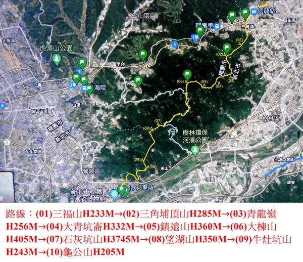 十山標高:三福山(H233M)→三角埔頂山(H285M)→青龍嶺(H256M)→大青坑崙(H332M)→鎮遠山(H360M)→大棟山(H405M)→石灰坑山(H3745M)→望湖山(H350M)→牛灶坑山(H243M)→龜公山(H205M)