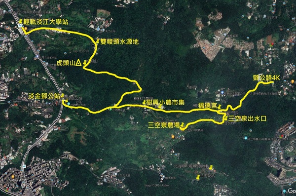 淡海輕軌淡江大學站→雙峻頭水源地→虎頭山步道支線登山口→虎頭山基石→樟栳坪→鄧公路櫻花大道→樹興社區小農市集→三空泉農場→鄧公路櫻花大道→淡金鄧公站