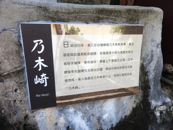 根據南庄公學校沿革史冊記載,乃木總督率先拋磚引玉捐出30圓,其後地方人士陸續募集經費,寄附金計本省人17名日本人31名共48名;總額274圓,鋪設石階並經歷多次整修而成。後人為感念乃木希典仁心,於是將石階取名為「乃木崎」,昔稱「乃木板」(NohiZaka),客語稱「乃木崎」(Saka),「崎」斜坡路之意,行走其間古意盎然,形塑本鄉樸實的老街風華。
