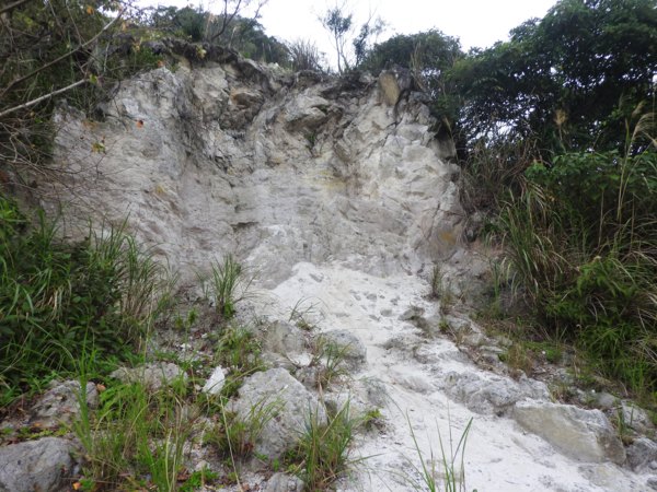「北投貴子坑岩壁」的最底層,呈現灰白色或乳白色,略帶透明,是由砂粒堆積而成的沉積岩。砂粒中含有石英礦物,所以稱為「石英砂岩」;用手觸摸砂岩,可感覺到砂粒膠結在一起的粗糙感;且含有少量的白色「伊來石」和「高嶺土」(俗稱:北投土),是製造陶器及瓷器的主要原料。