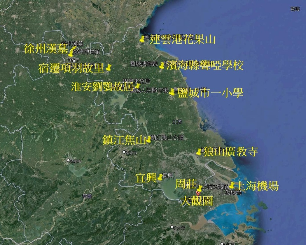 上海機場→南通狼山廣教寺→鹽城人民路市場→鹽城市一小學→鹽城濱海縣聾啞學校→連雲港花果山→徐州漢墓→徐州博物館→宿遷項羽故里→淮安劉鶚故居→淮安周恩來故居→鎮江焦山公園→宜興祝英台墓→崑山周莊→上海大觀園→上海機場