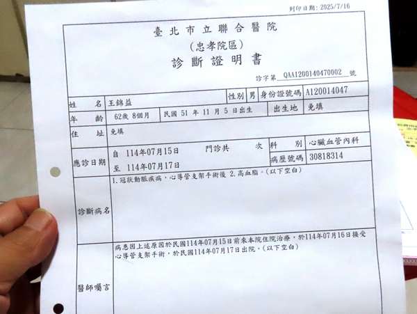 檢查結果一條血管需要裝2支支架,右邊一條血管鈣化嚴重,只能擇日再找榮總醫院處理