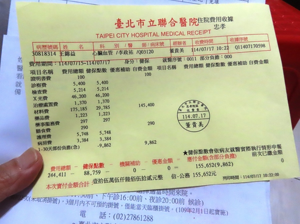 10:25 出院櫃台結帳,費用155,652元 (支架自費145,400元)