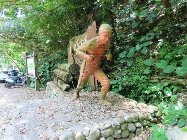 入口標誌明顯,旁邊常見早期木馬運材雕像與導覽牌