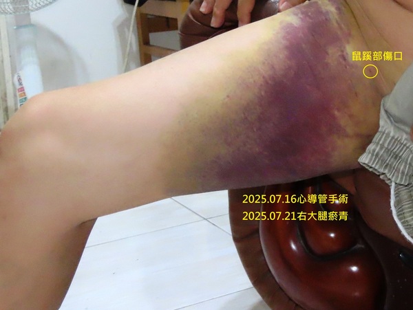 15:28 回家察看心導管手術股動脈(鼠蹊部)「下針部位」傷口瘀青情況
