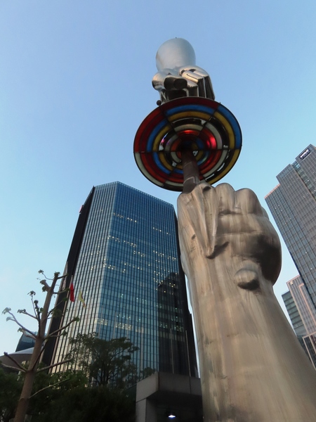 「文明的節奏-天人境界」位於南港展覽館外,由林舜龍創作,作品的巨大手型象徵天人臨界,彩環代表無限延伸,意指文明透過與自然的協調,得以滋養生命、拓展無限的可能性。
