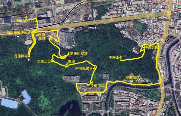 中南山海拔62公尺,立有台北市都計處四等三角點No. 112,座標2771716 311028 ,由忠孝東路7段尾中南街168巷大峰批發百貨旁入,循山徑可至山頂,基點位於廢棄碉堡上方。國家生技研究園區聯外道路隧道在其下穿越。