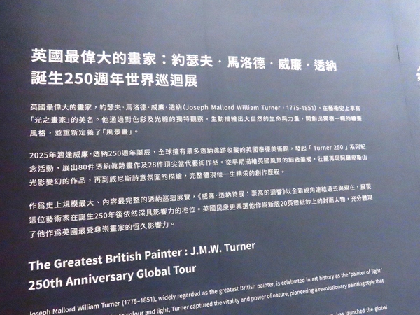 英國最偉大的藝術家威廉.透納,將其大部分作品遺贈給英國,並收藏於泰德美術館,本展將帶來高達80件威廉.透納真跡,涵蓋素描、水彩以及珍貴油畫,內容巧妙結合透納的旅行經歷與創作主題,以始於英國風景、走入山間、歷史故事、威尼斯、海上風暴、海天之間、大自然的崇高美學等主題,分為七大展區,貫穿他精彩的創作生涯。