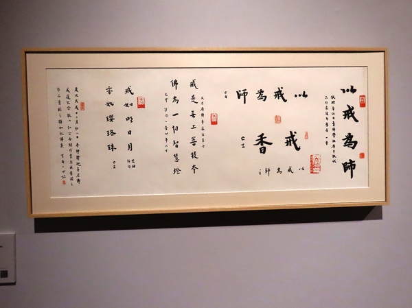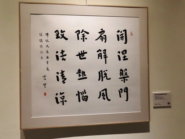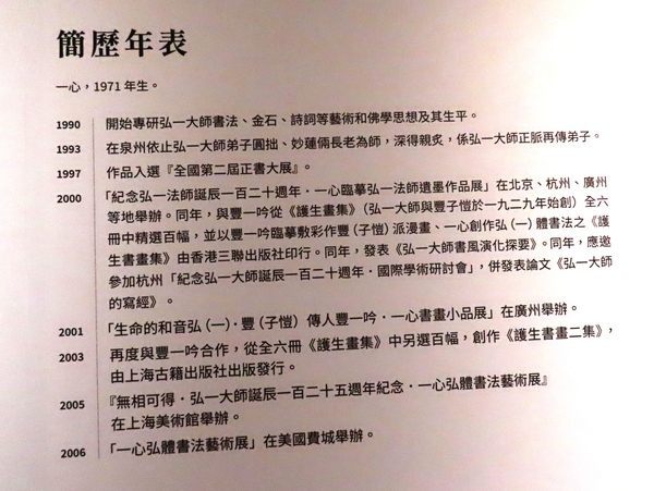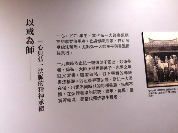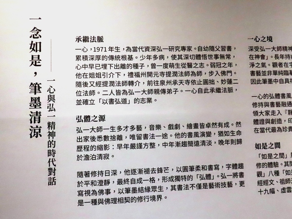 主辦單位表示,一心師於旅美後創建「美國國際弘一大師研究中心」,專注於弘一大師書法的鑒賞、研究、傳承與推廣,並已多次策劃重大展覽展出,本次展覽即是為紀念弘一大師誕辰一百四十五週年,也是一心師在臺灣的首次展覽,堪稱一場兼具藝術與精神傳承意涵的文化盛事。一心師的弘體書風所追求的並非形似,而是將修持與書藝融通於心,從出家後近似苦行的生活,到今日恆常的參禪修行,他始終一心不亂,甘之如飴,也因此,他的書藝表現帶有一種獨特的禪境,讓弘體書法不僅重現筆墨之姿,更凝聚出一股靈魂與精神的力量。